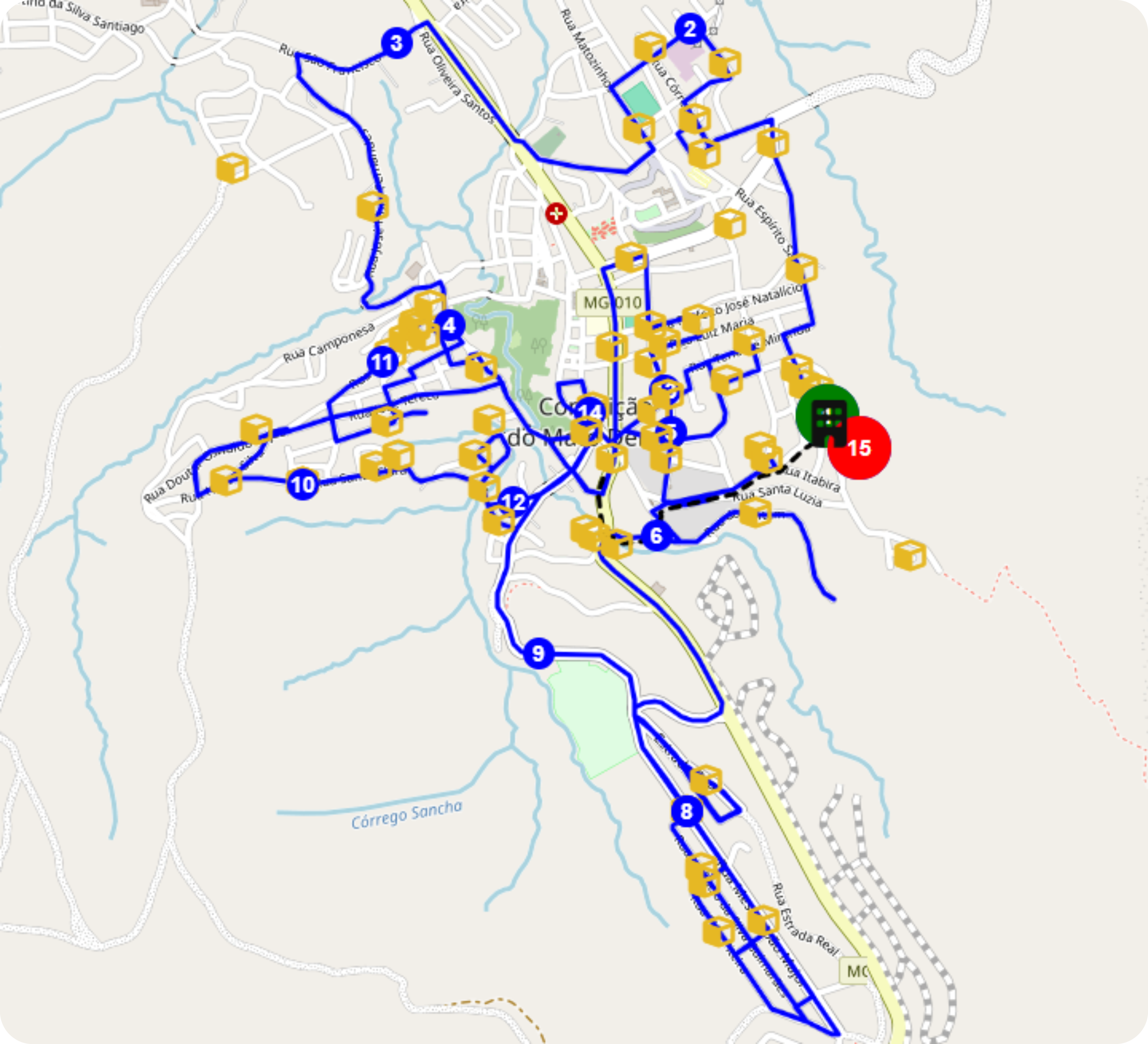Exibe um mapa do trajeto percorrido pelo motorista, coletado por meio da utilização do aplicativo Irisys. A visualização inclui ícones que identificam as localidades do service center e dos pacotes, além de mostrar as localidades de abertura e fechamento da rota no app e um outro dado importante, que é a quilometragem percorrida.